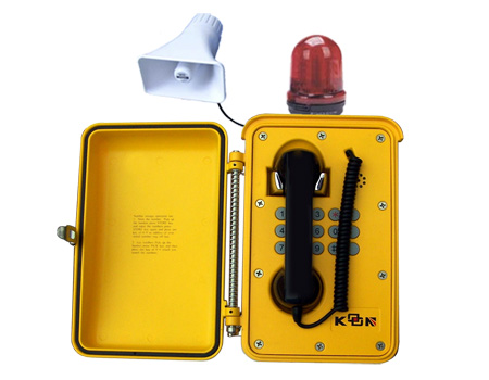 针对电厂、矿山、选煤厂等灰尘多、环境恶劣等特点,普通固定电话不能满足通信调度的需要,我公司开发了KNSP-08-A增强型防水扩音抗噪电话机,外置警灯,在电话来时,警灯开始闪烁。主电路选用工业级ATML单片机控制,性能稳定、智能化程度高,程序可升级。